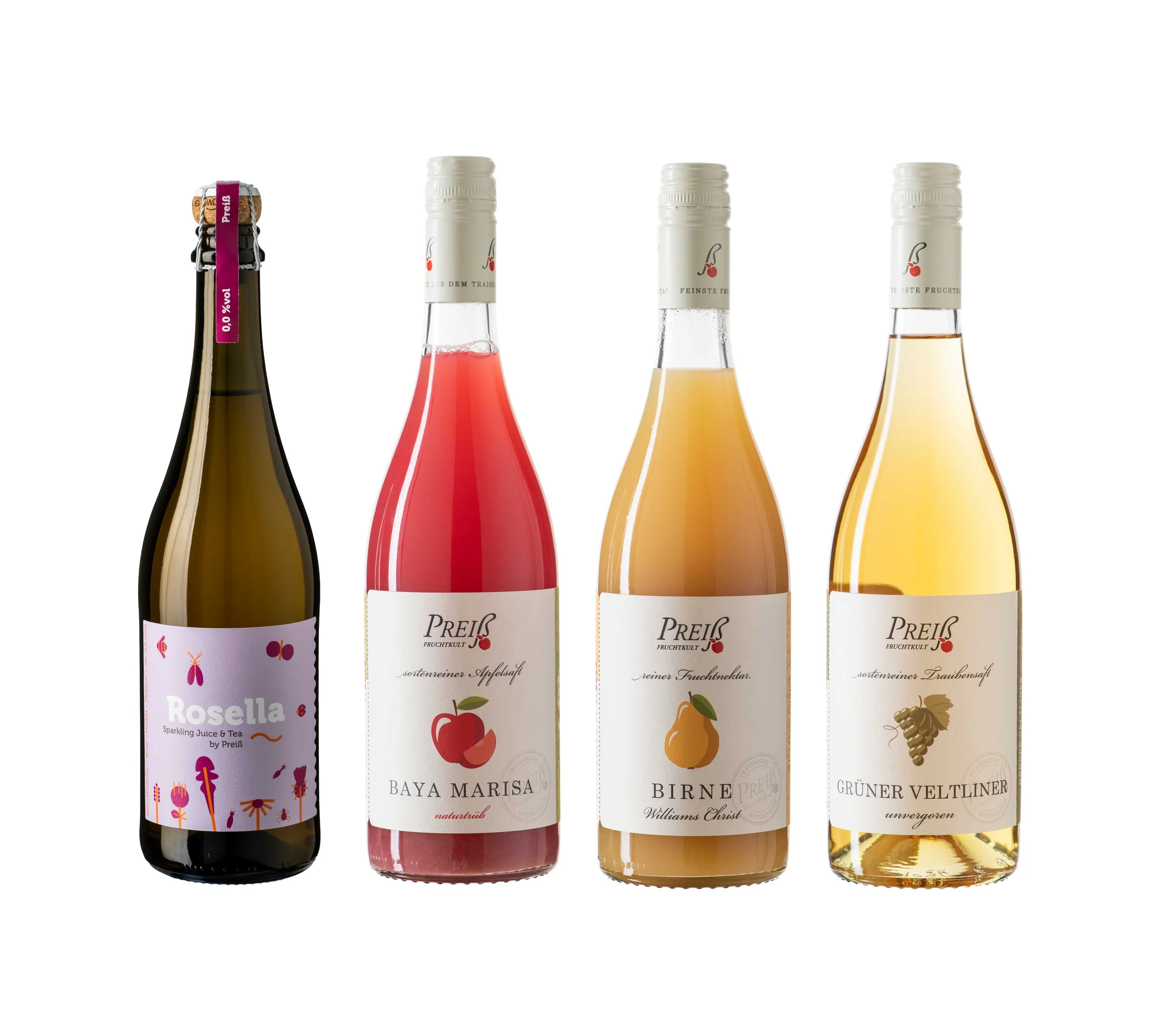 Bei dem Sparkeling Juice & Tea „Rosella“ handelt es sich um eine alkoholfreie Alternative zu Wein oder Sekt. Im Paket enthalten sind drei Flaschen „Rosella“, der Apfelsaft „Baya Marisa“, der Fruchtnektar „Birne Williams Christ“ und der Traubensaft „Grüner Veltliner“.