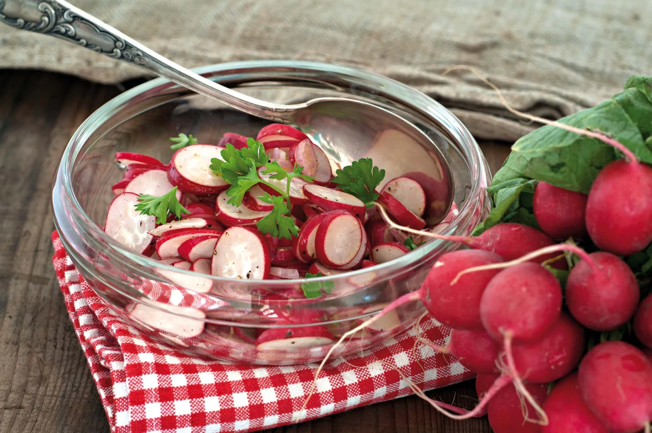 Fünf Portionen Gemüse und Obst pro Tag liefern reichlich Vitamine, Mineralstoffe, Ballaststoffe und sekundäre Pflanzenstoffe. Bevorzugen Sie saisonale und regionale Gemüse- und Obstarten, aktuell etwa Radieschen, Spinat, Mangold usw. Sie haben einen sehr hohen Wassergehalt und nur wenige Kalorien.