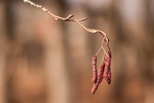 Die heimische Erle ist aktuell noch in Winterruhe. Sie darf allerdings nicht mit der Purpur-Erle verwechselt werden, die bereits Wochen vor ihr und somit zeitgleich mit der Hasel blüht. Die Purpur-Erle stammt aus Sibirien, ist somit kälteresistent und widerstandsfähig und trägt aufgrund ihrer zunehmenden Verbreitung hierzulande bereits beträchtlich zum Pollenflug bei.