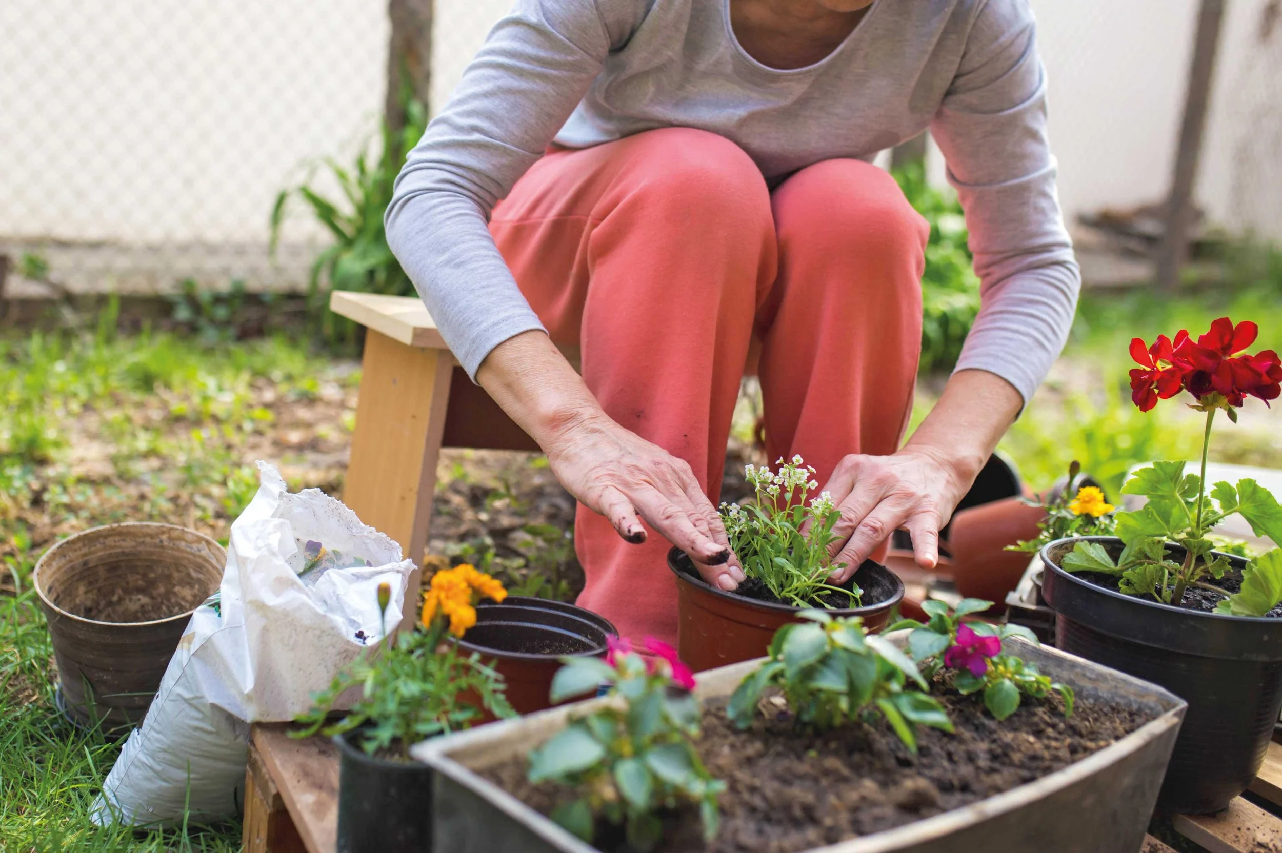 Mit Einschränkungen im Garten werken: Kleine Hilfsmittel wie eine Bank erleichtern die Arbeit.