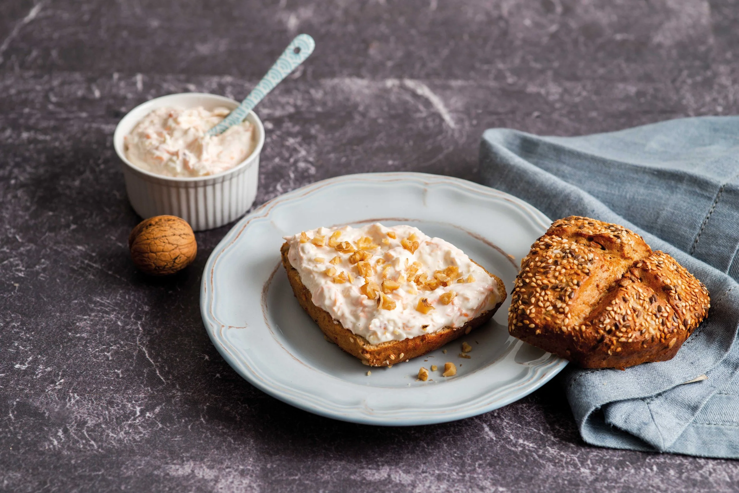 Topfen mit Sauerrahm, Salz, Pfeffer und Kren gut vermischen. Karotten und Apfel reiben und unter die Topfenmasse rühren. Brot oder Weckerl mit dem Aufstrich bestreichen und mit den gehackten Walnüssen bestreuen.