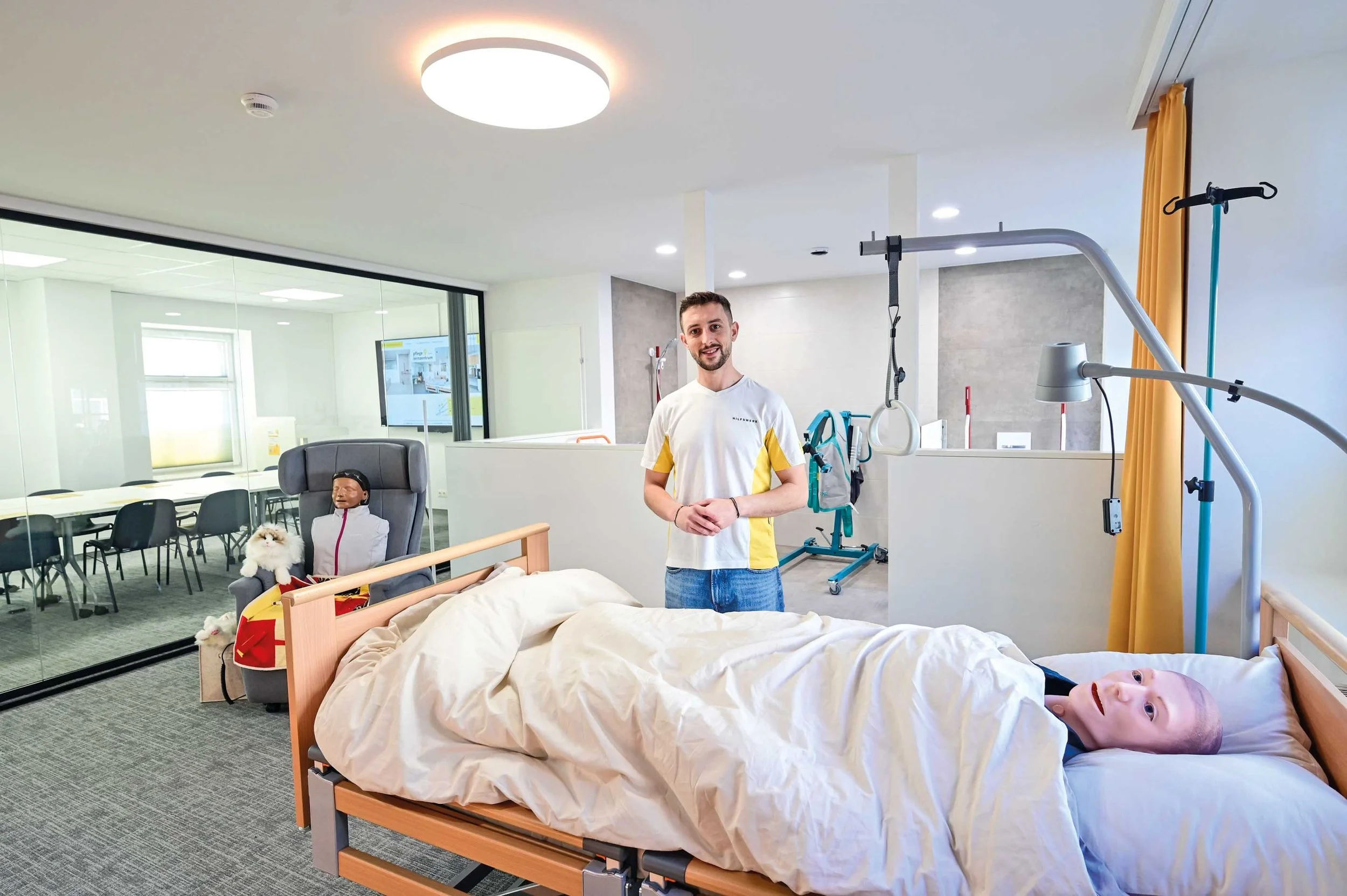 Eröffnet wurde das Pflege-Lernzentrum im September 2025 mit mehreren Kick-off-Veranstaltungen. Schon der Aufbau unterscheidet sich bewusst von klassischen Schulungsräumen: Neben einem Seminarraum gibt es eine realitätsnah gestaltete Lernwohnung. „Pflege ist Alltag – und genau so soll sie hier auch gelernt werden“, sagt er. Theorie und Praxis greifen ineinander: Was im Seminarraum erklärt wird, kann unmittelbar in der Lernwohnung umgesetzt werden. „Dieser geschützte Rahmen nimmt Angst und schafft Vertrauen.“ Geübt werden unter anderem das Drehen im Bett, das richtige An- und Auskleiden, Inkontinenzversorgung oder Körperpflege. Fachpersonal begleitet jeden Schritt. „Viele sind überrascht, wie viel leichter Pflege mit den richtigen Handgriffen wird“, so Hochreiner.